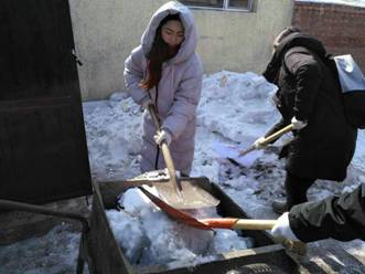 前往流浪狗散养大院的志愿者主动向附近居民借来推车和铁锹等清雪工具,积极开展大院的清洁工作。为防止积雪影响到附近居民的正常生活,他们将装满一车车的积雪推到远隔一条街的垃圾点。志愿者们乐在其中,一点都不觉得累。直到下午1点,志愿者们才完成清理大院工作。